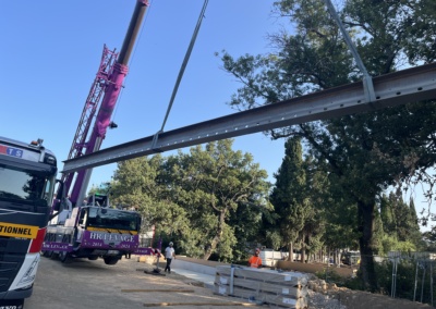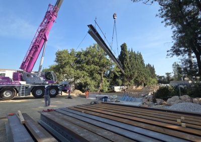 Projet : Cet ouvrage construit dans le cadre d’un marché public pour la commune de Saint Maximin est constitué de 6 poutres précontraintes fabriquées en usine de 21m de longueur et acheminées sur site par convoi exceptionnel avec une pose à la grue de 250T.