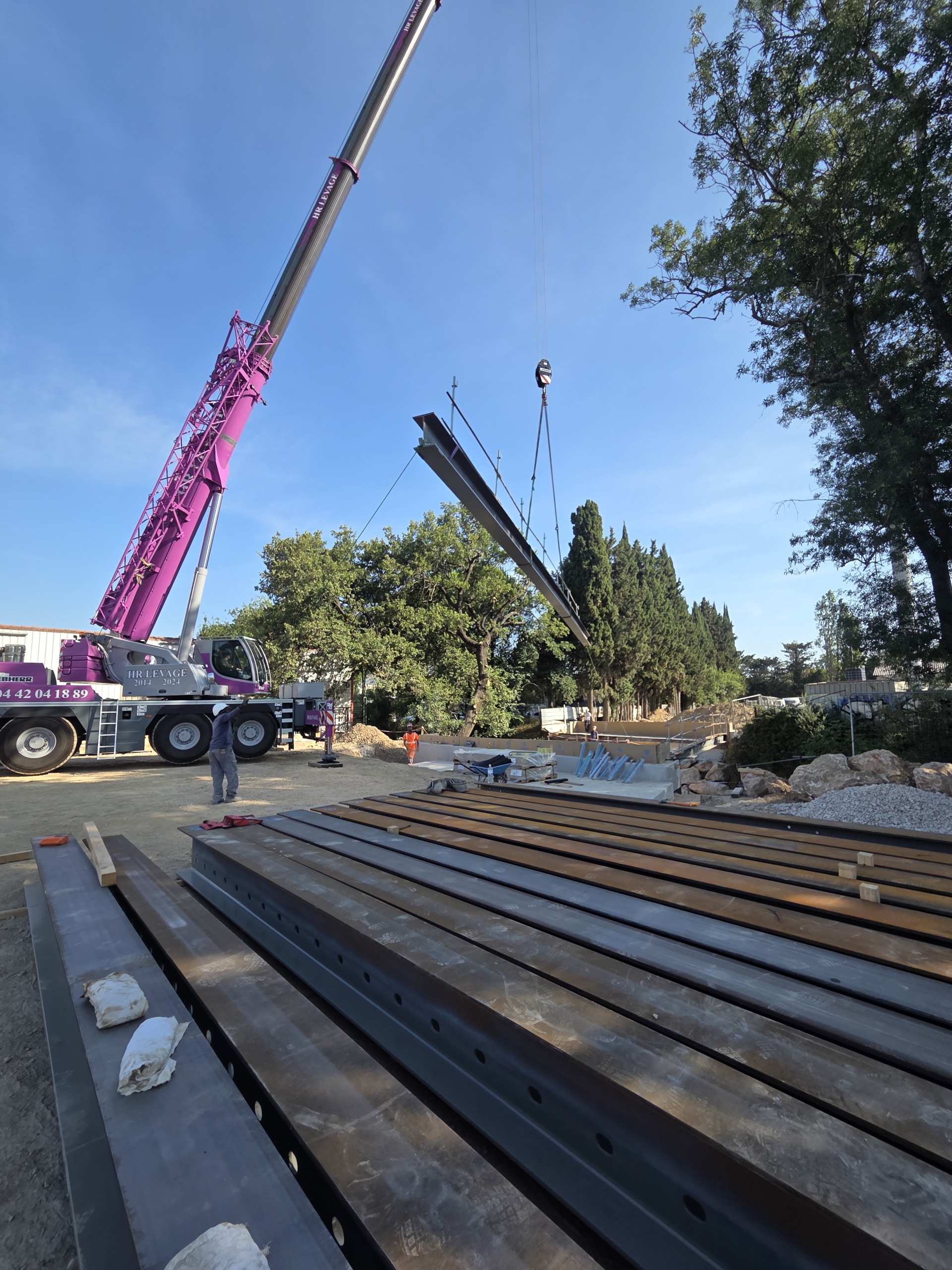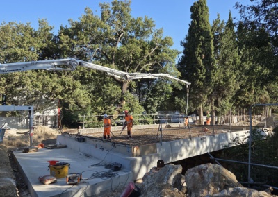 Cet ouvrage construit dans le cadre d’un marché public pour la commune de Saint-Maximin est constitué de 6 poutres précontraintes fabriquées en usine de 22m de longueur et acheminé sur site par convoi exceptionnel avec une pose à la grue de 250T.