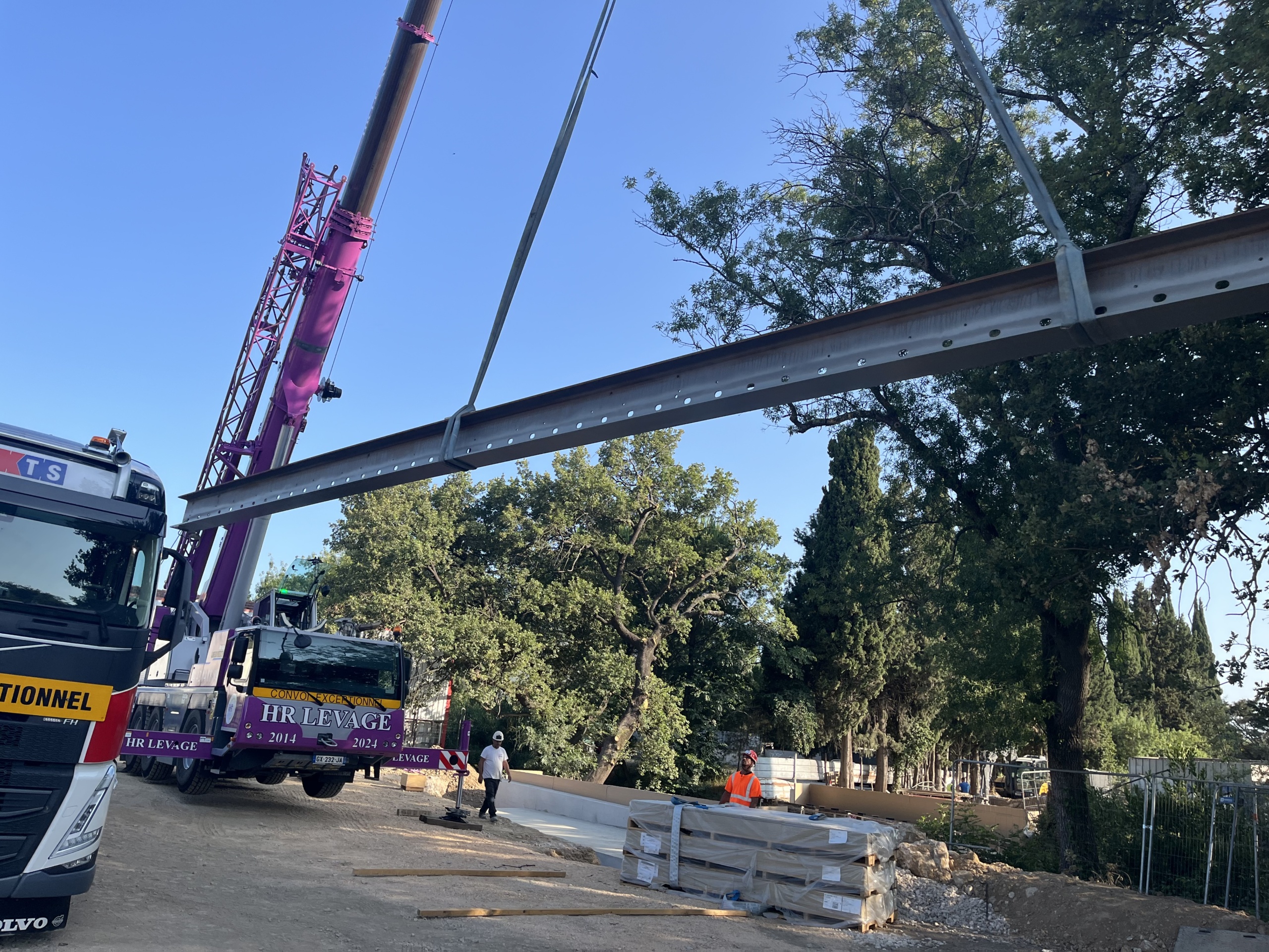 La passerelle de 65m de longueur sur 4 travées sera déposée par tronçon et évacuée de nuit sur convoi exceptionnel. Le poids global de l’ouvrage est de 40 tonnes.
